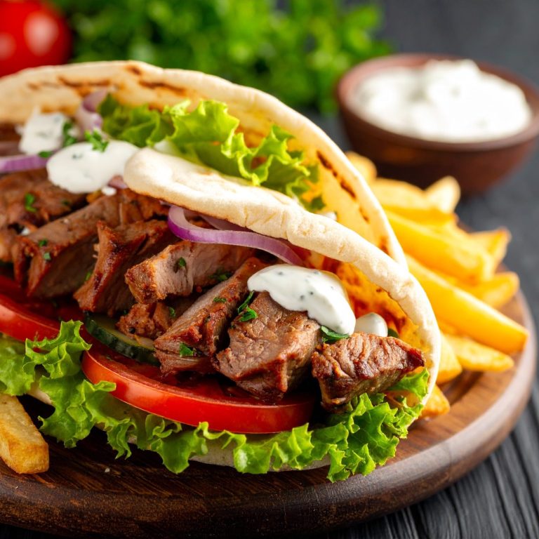 Dünn geschnittenes Schweinefleisch vom Spieß mit Brot oder als Menü mit diversen Beilagen